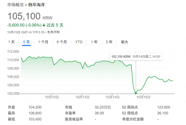 路透社报道,中国商务部宣布反制韩华海洋5家美国相关子公司之后,韩华海洋股价10月14日收盘下跌5.8%,此外,韩国现代重工股价也下跌4.1%。